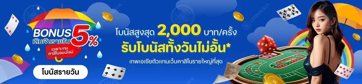 โบนัสเติมเงินรายวัน 5% เฉพาะเกมคาสิโนออนไลน์ สูงสุด 2,000 บาทวิธีขอรับโปรโมชั่น สมาชิกมีสิทธิ์รับโบนัสพิเศษนี้ได้ทุกยอดฝาก รับโบนัสทั้งวันไม่อั้น* พิเศษเฉพาะ Gclub เท่านั้น สำหรับเกม Goldenslots และ Sbobet ขอรับได้เฉพาะยอดแรกของวัน ตัดรอบ 10.30 น. – 10.29 น. สมาชิกมีสิทธิ์รับโบนัสเติมเงินสูงสุด 2,000 บาท ดังนี้ ยอดฝากขั้นต่ำ โบนัส ยอดเทิร์นโอเวอร์ 1,000 5% 10 เท่า สมาชิกที่ขอรับโบนัสจะต้องมีข้อมูลไม่ซ้ำกับฐานข้อมูลที่ทางเว็บไซต์มีอยู่ เช่น ชื่อ-นามสกุล, เบอร์โทรศัพท์, หมายเลขบัญชี, IP Address วิธีคำนวณยอดเทิร์นโอเวอร์ (ยอดเงินฝาก + โบนัส) x จำนวนเท่า = ยอดเทิร์นโอเวอร์ ตัวอย่างที่ 1: การคำนวณยอดเทิร์นโอเวอร์ เมื่อสมาชิกมียอดฝาก 1,000 บาท และได้โบนัส 5% (1,000 […]